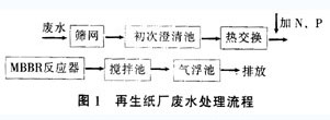 美國某一新建再生紙廠,最大處理量為1325m3/d,BOD5質量濃度為350mg/L。經過一系列的小規模試驗后,安裝2個串聯的MBBR反應池,每池容積81.7m3,總池容為163.4m3。載體填充率為60%,總用氣量為1700m3/h。處理流程見圖l。浮渣用壓濾機脫水。此系統BOD5去除率達95%。MBBR反應器后續氣浮池出水排入附近河流。