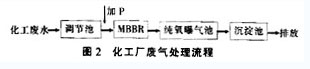 美國一化工廢水處理廠擴建工程,用MBBR法代替老的滴濾池。新建MBBR廢水設施占地面積僅為223m2。MBBR出水直接流入純氧活性污泥系統。處理流程見圖2。