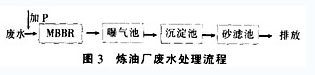 美國菲力普石油公司有一每天提煉11萬桶原油的煉油廠,一每天9.5桶液化天然氣分餾加工廠和一化工廠。廢水排放量平均19684m3/d,最高28388m3/d,原活性污泥法廢水處理廠為適應有機負荷的增加和提高硝化能力進行改造。將原初沉池改為MBBR系統,在池中填加流動層載體,填充率30%,池容1927m3,供氣量15463m3/h。改造后的MBBR和原有的活性污泥處理系統組合成HYBRID系統。改造后的處理流程見圖3。