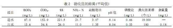 工程于開始調試運行,培菌采用的是接種培養方式,投加的活性污泥來自市內污水處理站。在調試的前幾天,射流曝氣時產生的異味較重,并伴有大量泡沫,幾天后,異味和泡沫均出現大幅度減少。由于氣溫較低,微生物生長緩慢,接種培養10d后,SV30一直較低,直到三周后,SV30才從最初的2.5%增加到13%,出水開始變清,鏡檢發現生物相較好,以鐘蟲為主,說明活性污泥已經培養成熟。當地環保部門提供的驗收監測結果見表2。