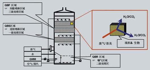 QBF技術自韓國SK集團下屬公司快寶株式會社引進,在國內廣泛應用。是利用附著特殊微生物的過濾器分解VOC(揮發性有機化合物)和惡臭物質,并利用專利前處理工藝一QVE進行流入濃度緩沖的最先進的生物過濾系統。