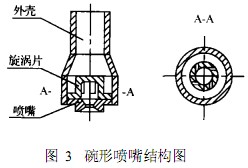圖 3所示為該系統采用的碗形噴嘴,它外殼內有一帶螺旋溝槽的芯子,水通過溝槽時,產生旋轉力,當通過縮口時 ,旋轉力逐漸加強 ,水離開噴口時形成中空的錐形水傘,水再于空氣沖擊分散成水滴。其特點是幕的屏蔽力強,邊部豐滿度高,噴射角較大,噴出的水流對周圍氣體影響劇烈,容易與氣體混合。