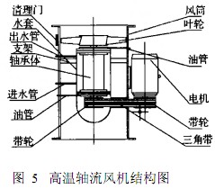 為解決煙囪倒煙問題 ,設計制作了專用于立窯煙囪的低壓大流量高溫軸流風機 (如圖5所示) ,它由機體、電機、葉輪、冷卻水管、 水套、油管和清理門等組成。根據立窯的排煙量和除塵系統的壓力降確定系統使用 2 臺軸流風機 , 每臺的風量為30 000 m3/h,軸流風機的風壓為 250 Pa水柱。多數機立窯煙囪直徑在 1.5 m左右 ,考慮到管道的阻力和管道的聯接 ,機殼直徑接近于煙囪直徑1.4 m。風機是在高溫 ( 50~200 ℃)腐蝕性氣體中工作 ,為了保護電機采用三角皮帶傳動 ,將電機置于機殼之外 ,三角帶和風機皮帶輪用鋼板包圍隔離起來避免與高溫煙氣接觸。風機軸承在高溫下連續運行 ,所以軸承的潤滑和冷卻就顯得非常重要 ,在結構上要保證軸承的可靠潤滑和密封 ,設置冷卻水套 ,通水降低軸承的溫度。為清除葉片上的積塵 ,在機殼上對應風機葉片處開設清理口 ,用鏟子定期清理風機葉片上的積塵。
