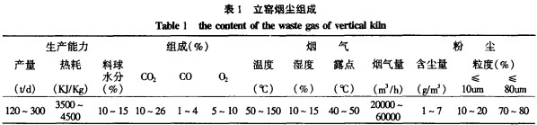 從表1可以看出 ,立窯生產具有以下特點: ①、煙氣量大 ,機立窯煙氣量為50000-60000m3/h ②、煙氣溫度波動大 ,一般為50-150 ℃ ③、煙氣濕度大 ,水汽含量為10%-15% ④、粉塵排放濃度大 ,一般為1-7g/m3 ,而且顆粒較粗。