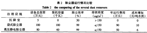 目前水泥立窯煙氣治理設施主要為沉降室、袋式除塵器和高壓靜電除塵器 ,其設備總投資、除塵效率、年運行費用、裝機容量、水泥噸成本增加等數據如表2。