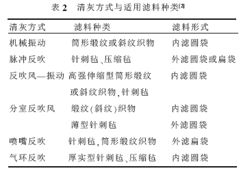 袋式除塵器的清灰方式是選擇濾料品種的另一個主要考慮因素。可根據不同的清灰方式,先確定選用的濾料品種。如用織布、針刺氈或玻璃纖維等(表2),然后再根據其他過濾條件確定濾料的詳細規格。