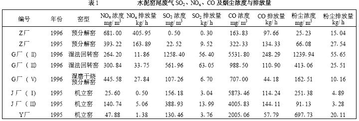 我們通過對華南地區多家水泥廠的調研, 深感水泥窯有害氣體的污染問題應引起足夠的重視, 表1 為有代表性的幾種水泥窯廢氣的SO2 、NOx 、CO及煙塵濃度與排放量。