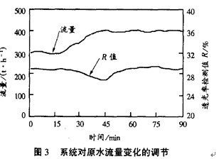 本系統中,由于井下工藝的要求,使得原水流量經常發生改變,對控制系統造成沖擊,而原水水質比較穩定,變化很緩慢,對控制系統不會造成大的沖擊,因此只考察控制系統對原水流量變化的調節能力。原水流量的變化幅度一般為30%-50%,但變化速度較快,經常在十幾分鐘內流量發生改變,因此對控制系統的要求比較高。圖3為在一次流量變化時系統的調節情況。從圖中可以看出,系統對原水流量的變化的調節比較迅速及時,大約15min內就可以將檢測值R調整到原設定值,而這對于沉淀池出水濁度的影響不大,可以滿足處理工藝的要求。