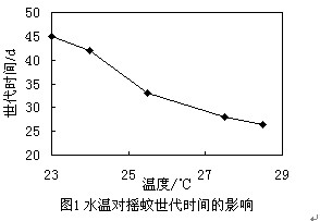 在食(shi)物(wu)和其他(ta)環境條件適宜的條件下(xia),升(sheng)高溫度(du)(du)可加快(kuai)搖蚊的生長發育速度(du)(du),縮短周轉率[3]。溫度(du)(du)與世代(dai)(dai)時間(jian)呈負(fu)相關性,搖蚊完(wan)成一個世代(dai)(dai)的時間(jian)隨溫度(du)(du)的變(bian)化情況(kuang)如(ru)圖1[4]。