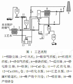 攜帶大量(liang)吸收劑(ji)和再循(xun)環產(chan)物的(de)(de)煙氣(qi)(qi)從反應(ying)(ying)器(qi)(qi)頂部排出(chu),進入靜電除塵器(qi)(qi),進行氣(qi)(qi)固分離。靜電除塵器(qi)(qi)入口(kou)煙氣(qi)(qi)含(han)塵量(liang)高達(da) 1 000 g·m- 3,經(jing)(jing)過(guo)靜電除塵器(qi)(qi)凈(jing)化后煙氣(qi)(qi)含(han)塵量(liang)不超過(guo) 50 mg·m- 3。靜電除塵器(qi)(qi)收集下來的(de)(de)灰(hui)中含(han)有大量(liang)未反應(ying)(ying)的(de)(de)吸收劑(ji),因(yin)此將(jiang)大部分收集到的(de)(de)灰(hui)返回反應(ying)(ying)器(qi)(qi)進一(yi)步(bu)反應(ying)(ying),一(yi)小部分灰(hui)作為脫硫副產(chan)品(pin)排至終(zhong)產(chan)物儲倉,再通過(guo)罐(guan)車外排。經(jing)(jing)過(guo)靜電除塵器(qi)(qi)凈(jing)化后的(de)(de)煙氣(qi)(qi)經(jing)(jing)增壓風機和出(chu)口(kou)擋板門后排入煙囪。工(gong)藝(yi)流程如圖 1所示。各個子系統(tong)的(de)(de)詳細描(miao)述見(jian)文(wen)獻。