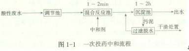 礦山廢水的特點是水量、水質變化大,廢水呈酸性。要合理確定礦山廢水的處理規模,并使被處理水的水質波動不要過大,往往需要設調節水池和調節水庫,先把水收集起來,再進行處理。礦山廢水是呈硫酸型的廢水,一般pH值為1.5~6,這樣低的硫酸含量,顯然沒有回收價值,因此往往采用中和處理的方法。 礦山酸性廢水的處理,一般采用石灰中和法。其工藝流程示于圖1-1。