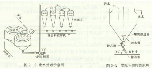 2.集中濃縮濃泥斗處理工藝 此種工藝是目前中小型燒結廠中常見的工藝。燒結廠廢水先進入濃縮池,經濃縮沉淀后的底部沉泥經砂泵揚送到濃泥斗進行處理,濃泥斗是架設在返礦皮帶口的構筑物,如圖2-2所示。污泥在濃泥斗中一般以靜置3~6d為宜,時間過長,會使污泥壓實,造成排泥困難;時間過短,會使污泥含水鋁過高。排泥是由螺旋推進排泥機完成的。濃泥斗的構造原理如圖2-3所示。