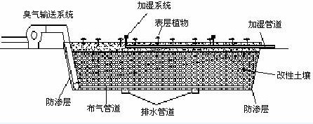 一般來講,生物濾床由土壤基質、布氣系統、加濕系統、基質內生物群落、表面植物等幾部分組成。生物濾床的主體是一個有一定面積和底部坡度的洼地,底層鋪防滲膜;臭氣布氣管道和onclick="g(‘排水管‘);">排水管道(多余的水分必須能夠很容易地從土壤生物濾床排走以防止onclick="g(‘厭氧‘);">厭氧條件的形成,排出的水返回污水處理系統)布于防滲膜上,布氣管道堆有100-150mm厚的卵石,以防布氣管道堵塞;布氣管道之上為由土壤、木塊、煤渣、樹皮碎塊、泥炭塊堆肥或脫水污泥等材料組合而成土壤基質;床體表層種植耐污植物;同時加濕系統亦布置于床體頂部,以污水廠污水作為水源,一方面保持床體的濕度,另一方面為床體內微生物的生長補充營養。圖1所示為生物濾床基本結構示意圖。