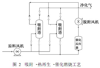 吸附-催(cui)化(hua)(hua)燃燒(shao)工藝(yi)(yi)是20世紀末(mo)發展起來的常規吸附方法與催(cui)化(hua)(hua)燃燒(shao)方法的組合工藝(yi)(yi)。該(gai)工藝(yi)(yi)原理是當吸附劑吸附達到飽和(he)后 ,用(yong)熱氣(qi)流將(jiang)有機物從吸附劑上脫附下(xia)來 ,使其再生 ,解吸釋放的高(gao)濃度(du)(du)VOCs廢氣(qi)送往催(cui)化(hua)(hua)器催(cui)化(hua)(hua)燃燒(shao) ,燃燒(shao)過程(cheng)中產生的熱量 ,一部(bu)分用(yong)于預熱解吸后的高(gao)濃度(du)(du)VOCs廢氣(qi) ,另一部(bu)分用(yong)于熱解吸 ,其典型工藝(yi)(yi)流程(cheng)可見圖2。