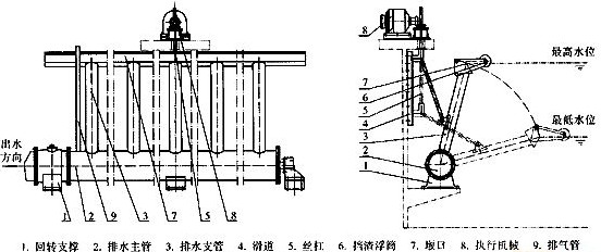 旋(xuan)轉式潷(bi)(bi)水(shui)(shui)(shui)器(qi)由潷(bi)(bi)水(shui)(shui)(shui)堰(yan)口(kou)(kou)(kou)、支(zhi)管(guan)(guan)、干管(guan)(guan)、可進(jin)行(xing)360°旋(xuan)轉的回(hui)轉支(zhi)撐、滑動(dong)支(zhi)撐、驅(qu)動(dong)裝置(zhi)、自動(dong)控制裝置(zhi)等組成。工(gong)作(zuo)時在驅(qu)動(dong)裝置(zhi)的作(zuo)用下(xia),潷(bi)(bi)水(shui)(shui)(shui)堰(yan)口(kou)(kou)(kou)以(yi)潷(bi)(bi)水(shui)(shui)(shui)器(qi)底部回(hui)轉支(zhi)撐中(zhong)心線為軸向下(xia)作(zuo)變速圓(yuan)周運動(dong),在此過程(cheng)(cheng)中(zhong)SBR反(fan)應池(chi)中(zhong)的上(shang)清(qing)液將通過潷(bi)(bi)水(shui)(shui)(shui)堰(yan)口(kou)(kou)(kou)流(liu)入潷(bi)(bi)水(shui)(shui)(shui)支(zhi)管(guan)(guan)、再經(jing)潷(bi)(bi)水(shui)(shui)(shui)干管(guan)(guan)排(pai)出。潷(bi)(bi)水(shui)(shui)(shui)工(gong)作(zuo)完(wan)成后(hou),潷(bi)(bi)水(shui)(shui)(shui)堰(yan)口(kou)(kou)(kou)以(yi)潷(bi)(bi)水(shui)(shui)(shui)器(qi)底部的回(hui)轉支(zhi)撐中(zhong)心線為軸向上(shang)作(zuo)勻速圓(yuan)周運動(dong),使潷(bi)(bi)水(shui)(shui)(shui)堰(yan)口(kou)(kou)(kou)停在待機(ji)位置(zhi),待進(jin)水(shui)(shui)(shui)、生化反(fan)應、沉(chen)淀(dian)等工(gong)序(xu)完(wan)成后(hou)再進(jin)行(xing)下(xia)一(yi)次潷(bi)(bi)水(shui)(shui)(shui)過程(cheng)(cheng)。旋(xuan)轉式潷(bi)(bi)水(shui)(shui)(shui)器(qi)結構(gou)示意(yi)見圖1。