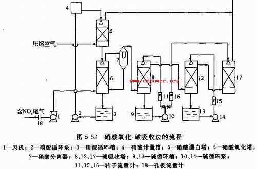 硝(xiao)(xiao)(xiao)酸(suan)(suan)氧(yang)(yang)(yang)(yang)化(hua)(hua)-堿吸收法的(de)(de)(de)流程如圖。從(cong)硝(xiao)(xiao)(xiao)酸(suan)(suan)生產系統來的(de)(de)(de)含(han)NOx的(de)(de)(de)尾(wei)氣用(yong)風機送人(ren)氧(yang)(yang)(yang)(yang)化(hua)(hua)塔(ta)(ta)內(nei),與(yu)漂白(bai)后(hou)的(de)(de)(de)硝(xiao)(xiao)(xiao)酸(suan)(suan)逆向接觸口經硝(xiao)(xiao)(xiao)酸(suan)(suan)氧(yang)(yang)(yang)(yang)化(hua)(hua)后(hou)的(de)(de)(de)NOx氣體進人(ren)硝(xiao)(xiao)(xiao)酸(suan)(suan)分(fen)離(li)器(qi),分(fen)離(li)硝(xiao)(xiao)(xiao)酸(suan)(suan)后(hou)依(yi)次進入三臺堿吸收塔(ta)(ta),經三塔(ta)(ta)串聯后(hou)放空。作為氧(yang)(yang)(yang)(yang)化(hua)(hua)劑的(de)(de)(de)硝(xiao)(xiao)(xiao)酸(suan)(suan)用(yong)硝(xiao)(xiao)(xiao)酸(suan)(suan)泵從(cong)硝(xiao)(xiao)(xiao)酸(suan)(suan)循環槽打(da)至硝(xiao)(xiao)(xiao)酸(suan)(suan)計量槽,然后(hou)定量地打(da)人(ren)漂白(bai)塔(ta)(ta),在漂白(bai)塔(ta)(ta)內(nei)用(yong)壓縮空氣漂白(bai)的(de)(de)(de)硝(xiao)(xiao)(xiao)酸(suan)(suan)進人(ren)氧(yang)(yang)(yang)(yang)化(hua)(hua)塔(ta)(ta),氧(yang)(yang)(yang)(yang)化(hua)(hua)NOx后(hou)又(you)進人(ren)硝(xiao)(xiao)(xiao)酸(suan)(suan)循環槽,空氣自漂白(bai)塔(ta)(ta)上部排空。