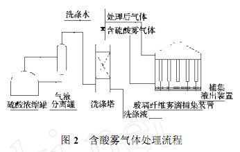 圖2 的流程操作原理為硫酸濃縮罐的酸蒸汽首先經冷卻后在氣液分離罐中分離, 氣相進入酸霧洗滌塔, 被洗滌后的酸霧最終進入纖維過濾器,在纖維捕集器中, 酸霧被捕集下來, 氣相經洗滌塔的排放筒排空, 纖維過濾器下部設有液封。