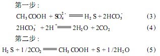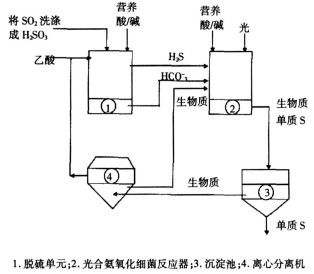Cork等(deng)已經(jing)研究了一種將 SO2 洗滌液(ye)中硫(liu)(liu)酸(suan)(suan)(suan)鹽 /亞硫(liu)(liu)酸(suan)(suan)(suan)鹽溶液(ye)轉(zhuan)化為單(dan)質(zhi)硫(liu)(liu)的(de)兩步(bu)法處理工(gong)藝(yi)。其生(sheng)化過(guo)程是利(li)用硫(liu)(liu)酸(suan)(suan)(suan)鹽還(huan)原(yuan)菌(jun)的(de)無氧(yang)呼(hu)吸作(zuo)用和和產硫(liu)(liu)菌(jun)的(de)光合作(zuo)用而(er)將硫(liu)(liu)酸(suan)(suan)(suan)鹽 /硫(liu)(liu)化物(wu)轉(zhuan)化為單(dan)質(zhi)硫(liu)(liu)。第一步(bu) , 在嚴格厭(yan)氧(yang)條件(jian)下(xia) , 通過(guo)利(li)用乙酸(suan)(suan)(suan)硫(liu)(liu)酸(suan)(suan)(suan)鹽還(huan)原(yuan)菌(jun) (Desulfobacter postgateii) 使硫(liu)(liu)酸(suan)(suan)(suan)根轉(zhuan)化為硫(liu)(liu)化氫 (式(shi) 3和式(shi) 4)。第二(er)步(bu) , 硫(liu)(liu)化氫通過(guo)嚴格厭(yan)氧(yang)光能自養微(wei)生(sheng)物(wu)泥生(sheng)綠菌(jun) (cblorbium li m icola) 轉(zhuan)化為單(dan)質(zhi)硫(liu)(liu) (式(shi) 5)。圖(tu)3為該工(gong)藝(yi)流程圖(tu)。