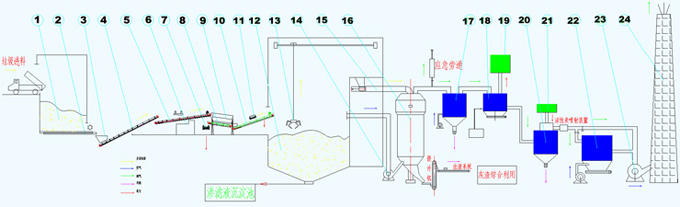 ![]() 1. 一號垃圾坑 2. 抓斗吊車 3. 受料斗 4. 板式給料機 5. 上料輸送機 6. 大件揀選平臺 7. 篩下物轉運輸送機 8. 篩下物輸送機 9. 滾筒破袋篩分機 10. 篩上物輸送機 11. 強力磁選器 12. 二號垃圾坑 13. 抓斗吊車 14. 鼓風機 15. 進料系統 16. 焚燒爐 17. 二次燃燒室 18. 余熱鍋爐 19. 熱水站 20. 半干法除塵器 21. 水處理系統 22. 布袋除塵器 23. 引風機 24. 煙囪 |