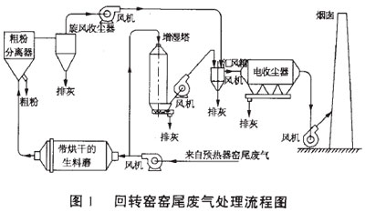 60年代初,在全世界范圍內開始重視節約能源。在這種形勢下帶懸浮預熱器的水泥回轉窯得以迅速發展,已經出現了10000t/d熟料生產線。為合理利用熱能,在帶懸浮預熱器的回轉窯系統中,通常將來自窯尾預熱器的低溫廢氣引入帶烘干兼粉磨功能的生料磨內,使生料磨在完成粉碎功能的同時,將含水分6%~8%的生料粉烘干至0.5%~1%,以利生料的均化、儲存。出磨的廢氣溫度也應高于露點溫度 300℃~400℃,以防止窯尾收塵系統不被冷凝、堵塞,一般控制在900℃~1000℃。出磨的含塵廢氣經粗粉分離器和旋風收塵器預除塵后,與從增濕塔出來經調質處理的窯尾廢氣在匯風箱匯集進入電除塵器,經電收塵器捕集凈化,干凈的煙氣排入大氣(見圖1)。