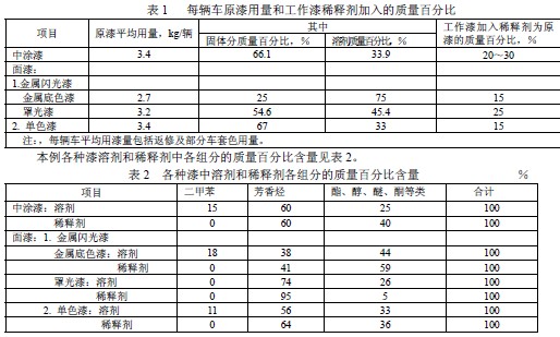 f. 確定涂料品種(zhong)、用(yong)量(liang)及工作漆(qi)(qi)(qi)(qi)(qi)中(zhong)各(ge)種(zhong)VOC 的含量(liang)。本例(li)采用(yong)某油漆(qi)(qi)(qi)(qi)(qi)廠生(sheng)產的有機溶劑型中(zhong)涂漆(qi)(qi)(qi)(qi)(qi)和(he)面漆(qi)(qi)(qi)(qi)(qi)(考(kao)慮(lv)到返修(xiu)及套色(se)用(yong)量(liang)),油漆(qi)(qi)(qi)(qi)(qi)廠提(ti)供的原漆(qi)(qi)(qi)(qi)(qi)由固(gu)體分(fen)和(he)溶劑等組成,噴漆(qi)(qi)(qi)(qi)(qi)時所用(yong)工作漆(qi)(qi)(qi)(qi)(qi)中(zhong)要(yao)另外加入稀釋劑。其產生(sheng)有排放限(xian)值要(yao)求的廢氣為二甲苯、甲苯、非甲烷總(zong)烴及過噴漆(qi)(qi)(qi)(qi)(qi)霧(顆粒物)。本例(li)每輛車各(ge)種(zhong)油漆(qi)(qi)(qi)(qi)(qi)用(yong)量(liang)及其工作漆(qi)(qi)(qi)(qi)(qi)中(zhong)溶劑、固(gu)體分(fen)和(he)稀釋劑含量(liang)見表(biao)1。