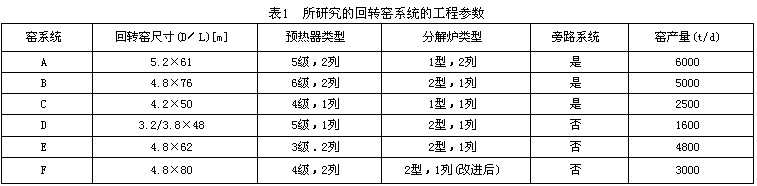 本次研究中,運行試驗是在配有如圖1、2所示的兩類分級燃燒、帶有分解爐的6個不同窯中進行的。運行設置系統地改變,相應地記錄了這些改變對NOx的排放影響。整個過程中NO生成和分解反應發生點和反應發生的條件都通過精準完備的NO濃度測定來進行確定。表1列出了它們最重要的工藝特征參數。