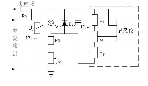 制定了比較完善的管理制度,該崗位的收益與電收塵的運轉率和收塵效率直接掛勾,做到有獎有罰。具體為:(1)對檢修人員,規定設備檢修完畢后,未能達到規定運行時間又出現故障的進行一定的處罰。(2)對每班電收塵的運轉率和收塵效率規定了考核指標,低于該指標要罰,高于該指標有獎。電收塵的運轉率和收塵效率通過用記錄儀記錄電收塵的二次電壓來衡量,有無信號記錄代表電收塵是否運行;記錄儀信號的大小代表收塵效率的高低(當然電收塵二次電壓和電收塵收塵效率之間存在一定的差距,但總體上講,二次電壓越高,意味著收塵效率越好)。電收塵二次電壓的記錄采用在原電收塵整流柜上加裝如圖3所示的電路來完成。