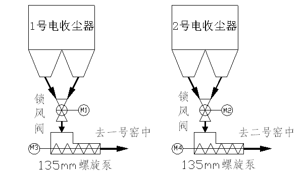 將1#、2#窯尾輸送系統分開,即將原來的窯尾輸送系統廢除,在電收塵的下料口處恢復原來的鎖風閥,然后在鎖風閥下分別加裝Ф135mm的螺旋輸送泵,直接將窯尾灰送到窯中喂灰系統(如圖2)。這樣能解決以下問題:(1)恢復了鎖風閥,提高了收塵效率。(2)因螺旋輸送泵的工作壓力相對較低(大約0.25∽0.3MPa之間),解決了氣源壓力偏低的問題。(3)兩個系統獨立分開,既有了設備維修機會(可隨大窯進行同步檢修),也不存在兩條窯的窯尾灰在窯中重新分配的問題了。(4)取消了Φ300mm的螺旋絞刀,也就解決了灰多的瞬間設備輸送能力不夠的問題了。