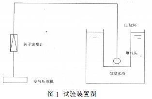 試驗裝(zhuang)置(zhi)見圖1。該裝(zhuang)置(zhi)采用空(kong)氣(qi)(qi)(qi)為氣(qi)(qi)(qi)源,用空(kong)氣(qi)(qi)(qi)壓(ya)縮機加壓(ya)后(hou),通過轉子流量計(ji)控制氣(qi)(qi)(qi)體(ti)流量,曝氣(qi)(qi)(qi)頭采用砂芯曝氣(qi)(qi)(qi)頭,向(xiang)1L燒杯中水樣(yang)充氧,形成氣(qi)(qi)(qi)液接觸(chu),對水樣(yang)中S2-進行(xing)催(cui)化(hua)氧化(hua),同(tong)時(shi)用恒溫(wen)水浴控制反(fan)應(ying)溫(wen)度,用秒(miao)表計(ji)時(shi)。