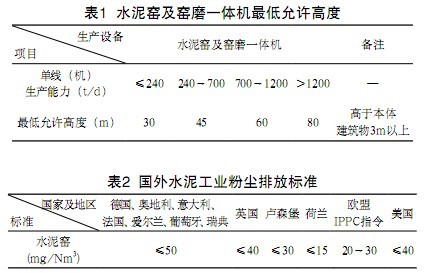 國家環境保護總局2004年12月29日頒布了《水泥工業大氣污染物排放標準》(GB4915-2004),統一了回轉窯和立窯的排放標準,不再按功能區規定排放標準,對現有生產線實行了統一的標準并設置了達標過渡期,提高了新建生產線水泥工業大氣污染物的排放標準。 2006年7月1日起至2009年12月31日止,現有生產線水泥窯及窯磨一體機排氣筒中的顆粒物排放濃度不得超過 100mg/Nm3 ;自2010年1月1日起,現有水泥窯及窯磨一體機排氣筒中的顆粒物排放濃度不得超過50mg/Nm3 , 單位產品排放量不得超過0.15kg/t,也就是說,隨著經濟的發展,國家對污染物的排放標準越來越嚴格。水泥窯及窯磨一體機最低允許高度見表1,國外水泥工業粉塵排放標準見表2。