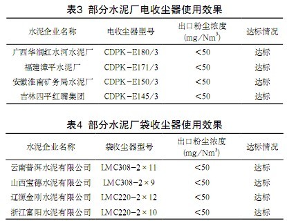 利用窯尾廢氣烘干工藝的水泥窯尾窯頭廢氣量約占整個水泥生產線廢氣量的60%,其中窯尾廢氣約占整個水泥生產線廢氣量的36%。由于窯尾廢氣溫度高、煙氣量大,比較難治理,每年都有大量的技術人員對窯尾廢氣收塵進行研究,并對收塵設備進行技術革新,以期達到更好的效果。對于水泥回轉窯窯尾廢氣治理選用電收塵器還是袋收塵器,選用袋收塵器時應該選用哪個系列的袋收塵器,有過很多探討。有的認為電收塵器的電耗比袋收塵器高,投資比袋收塵器大;有的認為電收塵器的電耗比袋收塵器低,電收塵器的投資比袋收塵器少;有的認為窯尾收塵選用電收塵器好,有的認為窯尾收塵選用袋收塵器好,眾說紛紜,給水泥廠投資者帶來很大的困惑,也給工藝設計人員在設備選用和選型時增加了難度。由于所從事工作的重點不一樣,所以得出的結論有所差異也在情理之中。從使用效果來看,電收塵器和袋收塵器在窯尾廢氣治理中都能滿足排放濃度不大于50mg/Nm3 的要求,做到達標排放。因此如何正確合理地選擇與使用窯尾收塵設備,做到既能滿足環保要求又能產生更大的經濟效益就顯得尤為重要。部分水泥廠電收塵器與袋收塵器出口排放濃度及達標情況分別見表3、表4。