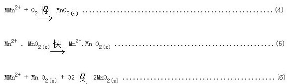 二氧化錳(meng)具(ju)有一(yi)定的(de)吸(xi)附能力,其BET值300m2/g左右。有研(yan)究指出,當(dang)PH<9.5時,Mn2+的(de)氧化速率相對較慢,主要通過吸(xi)附到二氧化錳(meng)表面后沉(chen)淀或過濾除去,見化學反應式(shi)(4)、(5)和(6)。