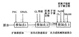 合(he)理(li)(li)安排各(ge)種水處(chu)(chu)理(li)(li)藥劑的(de)投(tou)(tou)加(jia)序(xu)列對強化(hua)凈化(hua)處(chu)(chu)理(li)(li)至關重要。很多水處(chu)(chu)理(li)(li)藥劑是不能(neng)混合(he)投(tou)(tou)加(jia)的(de),如鋁鹽和氫氧化(hua)鈉,陰和陽離子高分子聚合(he)物,氨與(yu)液(ye)氯和鋁鹽等(deng)。在實際生產(chan)中,要求(qiu)保證不宜(yi)混和藥劑至少3-5min的(de)投(tou)(tou)加(jia)間隔。可參考(kao)下圖確定各(ge)處(chu)(chu)理(li)(li)藥劑的(de)適宜(yi)投(tou)(tou)加(jia)點: