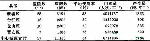 福州市現有省、市、區醫院以及衛生院等大小醫療機構約250家,其中縣級以上醫院80家(位于中心城區57家),衛生院170家,現將中心城區2002年醫療單位產廢基本情況列表,見表1。
