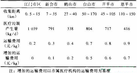 如果將這3個地區的醫療垃圾均運送至焚燒中心進行處理,將出現以下幾個問題:(1)焚燒的費用因為運輸費用的增加,而使得單位垃圾處理成本增加。據廣州市醫療垃圾處理檢查結果表明,雖然廣州市建有集中處理醫療垃圾焚燒中心,但是實際處理情況并不十分理想。究其原因一方面是因為部分醫療機構不愿意交納垃圾處理費,而處理中心又不愿意花費過多的運輸費用去收集少量醫療垃圾(臺山市醫療垃圾產生量雖然相對較多,但是醫療機構分散,范圍廣,難以收集)最終導致這部分醫療垃圾混入生活垃圾,或流入其他不規范的垃圾處理中。(2)長途運輸容易造成二次污染。醫療垃圾含有大量細菌和病毒,長時間的運輸途中,有可能造成疾病的傳播。而且小型的醫療機構及個體門診一般位于村鎮居民區,醫療垃圾車進入不合適。(3)收集時間太長難以在規定時間內將所有的醫療垃圾收集完全。例如,恩平市的醫療機構,除了恩平市人民醫院和恩平市沙湖鎮中心衛生院外,其余均為有少量床位的醫院或無床位的門診部或私人診所,垃圾產生量少,且分布廣,距離收集中心110~150km,如果將這些垃圾都由處理中心的垃圾車來收集,則難以按時完成。