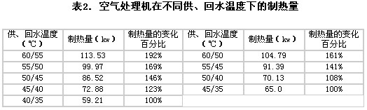 該機組在(zai)標準制冷工(gong)況(kuang)下(xia)的(de)額定(ding)制冷量(liang)為(wei)70kw,我們按(an)150w/m2的(de)冷負荷指(zhi)標選定(ding)一個該空氣處理機剛好能夠(gou)承擔的(de)基本空調單(dan)元,其(qi)面積為(wei)M,則M=70×103/150=467(m2);而該空調單(dan)元上的(de)熱負荷為(wei)Qh=100×467=46.7(kw),當該空氣處理機的(de)處理風量(liang)為(wei)10000m3/h,空氣進(jin)口(kou)溫(wen)度為(wei)20℃時,其(qi)在(zai)不同的(de)供、回(hui)水溫(wen)度下(xia)的(de)制熱量(liang)見(jian)下(xia)表2: