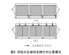 陰極采用陰極小分區結構+頂部塵外電磁錘振打清灰技術。采用小分區結構技術,可劃出小振打單元,提高振打清灰效果。采用的剛性桅桿式陰極小框架結構,與常規側打型電除塵器陰極大框架結構相比,振打傳遞區間減小了一半,大大提高了加速度分布的均勻性。圖5所示為三電場電除塵器陰極分區結構及振打對比情況。