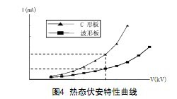 (4)試驗證明,在相同極距、相同陰極線的條件下,無論是冷態空載,還是熱態負載條件下的伏安特性,波狀形陽極板的伏安特性曲線更為平緩,其閃絡電壓總是高于C形板(見圖4)。這進一步表明了波狀形陽極板表面的場強分布較均勻,沒有明顯的峰值。而C形板表面的場強分布均勻性較差,會過早出現火花。