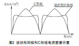 (3)波狀形陽極板與針刺線相匹配,與C形板相比,電流密度峰值低,平均電流密度較高,具有較強的捕集高比電阻粉塵能力,可提高對細微塵粒的擴散荷電與捕集效率。由于陽極板表面上粉塵層內的電場強度為E塵層=ρi(ρ為粉塵的比電阻,i為電流密度),因此,對于同樣情況下的煙塵(ρ為定值),i愈大則塵層兩側電位差愈大,愈易將其中氣體擊穿而生成反電暈,此時會產生大量的正負離子,中和帶電的粉塵粒子,具體表現為電流劇增,電壓下降,除塵效率明顯下降。從圖3中可看出,C形板正對電暈線處電流密度出現峰值,容易引發反電暈現象。