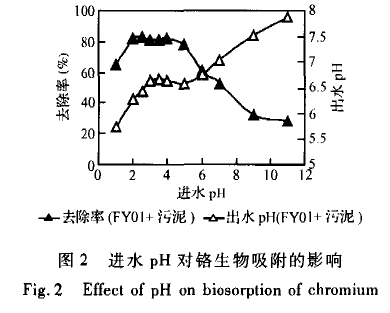 處理進水(shui)速度為(wei)500 mL/h,pH調節(jie)為(wei)1~11的(de)(de)l1個電鍍廢(fei)水(shui)水(shui)樣(yang)2 h后,鉻的(de)(de)去(qu)除率與(yu)出(chu)水(shui)pH的(de)(de)變化結果如(ru)(ru)圖2所示。與(yu)單菌株生物吸(xi)(xi)附(fu)劑(ji)相(xiang)比,該復合生物吸(xi)(xi)附(fu)劑(ji)對(dui)進水(shui)pH的(de)(de)適應能力(li)(li)具(ju)有(you)較明(ming)顯(xian)的(de)(de)優勢 。在(zai)進水(shui)pH=l~6時,對(dui)60.4 mg/L鉻的(de)(de)去(qu)除率高達(da)60.4% ~83.0% ,顯(xian)示出(chu)了(le)較強的(de)(de)耐廢(fei)水(shui)pH沖擊的(de)(de)能力(li)(li)。這主要是(shi)因(yin)為(wei)FY01由多菌種組成,部分菌種對(dui)鉻、銅等重金屬廢(fei)水(shui)具(ju)有(you)較強的(de)(de)生物吸(xi)(xi)附(fu)和體(ti)內(nei)積累(lei)性能¨’ 。菌群(qun)中不同的(de)(de)菌種在(zai)相(xiang)應的(de)(de)適宜(yi)pH值下(如(ru)(ru)擲孢酵母的(de)(de)適宜(yi)pH=2~4,產朊(ruan)假絲酵母的(de)(de)適宜(yi)pH=2—3) ,能有(you)效地對(dui)Cr”進行還原(yuan),實現總Cr的(de)(de)吸(xi)(xi)附(fu)積累(lei)。其(qi)中Cr 的(de)(de)還原(yuan)如(ru)(ru)方程式(shi)(1)~(3)L 3,9j: