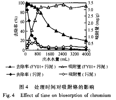圖4顯示(shi),鉻(ge)(ge)的(de)去除效(xiao)率(lv)均隨著處(chu)理水(shui)量(liang)(liang)(liang)的(de)增加而(er)下(xia)降(jiang);吸(xi)(xi)附(fu)量(liang)(liang)(liang)的(de)變(bian)化(hua)趨勢則存在較大(da)明(ming)顯的(de)差異(yi)。其中,當出(chu)水(shui)水(shui)量(liang)(liang)(liang)為(wei)0~1000 mL時(shi),10 g FY01和5 g活性污(wu)(wu)泥(ni)對(dui)鉻(ge)(ge)的(de)吸(xi)(xi)附(fu)量(liang)(liang)(liang)快速(su)增加并接(jie)近吸(xi)(xi)附(fu)飽和,飽和吸(xi)(xi)附(fu)量(liang)(liang)(liang)為(wei)3,1~3.37 mg/g。而(er)15 g活性污(wu)(wu)泥(ni)對(dui)鉻(ge)(ge)的(de)吸(xi)(xi)附(fu)量(liang)(liang)(liang)在出(chu)水(shui)水(shui)量(liang)(liang)(liang)為(wei)200~800 mL時(shi)較高,隨后出(chu)現下(xia)降(jiang)。這是因為(wei),利用(yong)污(wu)(wu)泥(ni)作為(wei)吸(xi)(xi)附(fu)材料單獨處(chu)理電鍍廢(fei)水(shui)時(shi),水(shui)量(liang)(liang)(liang)過大(da)會導致菌膠團發生解體和鉻(ge)(ge)的(de)脫附(fu)。