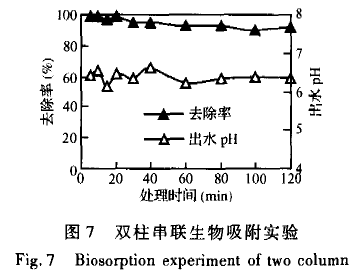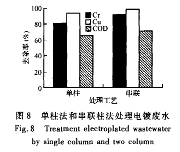 本(ben)實驗分別采(cai)用(yong)了單柱(zhu)(zhu)吸附(fu)(fu)法和串聯柱(zhu)(zhu)吸附(fu)(fu)法處(chu)(chu)理(li)(li)電鍍廢(fei)(fei)水,每根柱(zhu)(zhu)裝10 g FY01和5 g活(huo)性污泥,單柱(zhu)(zhu)處(chu)(chu)理(li)(li)廢(fei)(fei)水1000 mL,雙柱(zhu)(zhu)處(chu)(chu)理(li)(li)2000 mL,處(chu)(chu)理(li)(li)時(shi)間均為(wei)2 h。圖8結果表明,串聯法處(chu)(chu)理(li)(li)該(gai)電鍍廢(fei)(fei)水是非常(chang)有效的(de),對(dui)廢(fei)(fei)水中60.4 Illg/L總Cr、4.51 mg/L Cu“和48.2 mg/L COD的(de)去除率分別高達92.1% 、99.2% 和71.4% 。