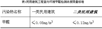 參照《民用建筑工程室內環境污染控制規范》(GB50325-2001),該規范適用于新建、擴建、改建的民用建筑工程,不適用于工業建筑、倉儲、構筑物和有特殊凈化衛生要求的房間。按照人們停留在建筑物的時間并考慮到老人和兒童身體承受差等因素,將民用建筑工程分為二大類:I類民用建筑工程包括:住宅、學校、醫院、老人建筑、幼兒園等;II類民用建筑工程包括:辦公樓、旅館、文化娛樂場所、書店、圖書館、體育館、公共交通等候室、餐廳等。根據建筑工程分類的不同,室內環境中甲醛的濃度限量也不同,如表1。