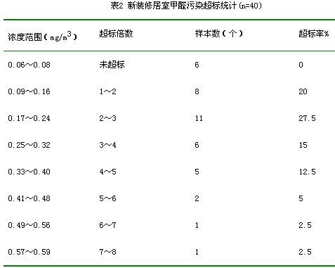 統計結果表明:裝修居室室內空氣甲醛超標較嚴重。甲醛檢測超標的40個樣品中超標程度小于1倍的樣品占20%,超標l-4倍的樣本量占62.5%,即小于超標4倍的樣本量占超標樣本數的81.8%;超標4-7倍的占超標樣本數22.5%;超標7-9倍的占超標樣本數2.5%;在樣本中所占比例極小。