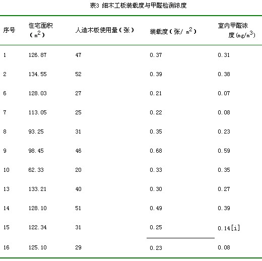 本論文通過對住宅裝修過程中以細木工板為代表的人造板材使用量的調查,以及住宅內甲醛氣體濃度的監測結果,試圖說明人造板材的使用量、裝載度(單位立方米室內空間甲醛散發材料――細木工板的使用量)與室內甲醛濃度的關系。細木工板的使用量、裝載度與室內甲醛濃度的監測結果見表3。