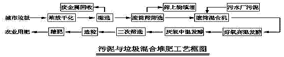 污泥與垃圾堆肥法是通過機械設備對污泥與垃圾混合物料進行好氧高溫發酵,再自然堆放厭氧中溫發酵的一種方法,主要包括:污泥與垃圾前處理、好氧高溫發酵、厭氧中溫發酵、后處理等四部分。