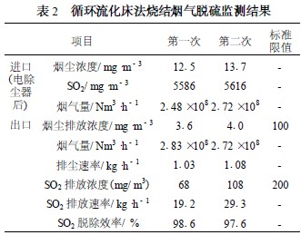 福建三鋼(gang)廠(chang)180 m2 燒結機(ji)采(cai)用循環流化(hua)床法煙氣脫(tuo)硫工藝,于2007 年(nian)10 月投入試(shi)運行。根據(ju)環境監測(ce)站對其(qi)進行的監測(ce)結果(表(biao)2) 表(biao)明,其(qi)脫(tuo)硫效率在98 %以(yi)上,脫(tuo)硫效果好,運行情況(kuang)較穩定。