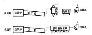 我們曾調查了二十幾家水泥廠的烘干機收塵器使用情況,對多種除塵器的性能進行了分析比較,最后選用LFEF抗結露玻纖袋除塵器,將原兩級除塵改為一級除塵,出烘干機氣體直接進入袋除塵器,處理后的廢氣經排風機排入大氣。改造前后的除塵系統流程見圖1所示。