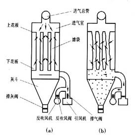 該(gai)種(zhong)型式的玻(bo)纖袋除塵(chen)(chen)器如(ru)圖(tu)(tu)2所(suo)示:其排(pai)氣(qi)(qi)閥、反吹風閥均(jun)設于下面排(pai)氣(qi)(qi)管(guan)處。正常工作(zuo)時如(ru)圖(tu)(tu)2(a),含塵(chen)(chen)氣(qi)(qi)體在(zai)排(pai)風機作(zuo)用下吸入進(jin)氣(qi)(qi)總管(guan);通過(guo)(guo)各進(jin)氣(qi)(qi)支管(guan)進(jin)入進(jin)氣(qi)(qi)室,均(jun)勻地(di)通過(guo)(guo)上花(hua)板,然(ran)后(hou)(hou)涌入濾(lv)袋,大(da)量粉(fen)塵(chen)(chen)被滯留在(zai)濾(lv)袋上,部分粉(fen)塵(chen)(chen)直接(jie)穿過(guo)(guo)下花(hua)板落入灰斗,而氣(qi)(qi)流則透過(guo)(guo)濾(lv)袋得到凈(jing)化,凈(jing)化后(hou)(hou)的氣(qi)(qi)流通過(guo)(guo)排(pai)氣(qi)(qi)閥進(jin)入引風機排(pai)入大(da)氣(qi)(qi)中(zhong)。