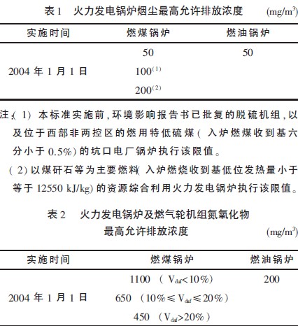 我國的能源消費以煤為主, 預測到2010 年、2020 年,我國煤炭產量將分別達到23 億t 和30 億t。煤碳在為工農業生產和人民生活提供豐富能源的同時,也成為我國環境污染的主要污染源。我國的環境形勢非常嚴竣,煙塵、粉塵、SOx,NOx 以及由此而產生的酸雨等對大氣環境造成了極大的危害,酸雨面積已超過國土面積的29%。燃煤電廠是煤碳的主要用戶,針對火電廠是排放煙塵及二氧化硫的重點行業的特點,我國相應制定了《火電廠大氣污染物排放標準》( GBl3223—1996) ,其中對火電廠SO2 的全電廠排放總量與各煙囪排放濃度實行雙重控制,有力推動了火電廠脫硫技術在我國的推廣應用。然而隨著國民經濟的迅速發展以及對能源消耗的進一步擴大,舊的環境控制標準明顯顯現出其滯后性和不足, 為此我國在2003 年底又制定了新的《火電廠大氣污染物排放標準》( GBl3223— 2003) , 現將相關的各主要污染物控制標準簡要列舉如表 1,表2 所示。